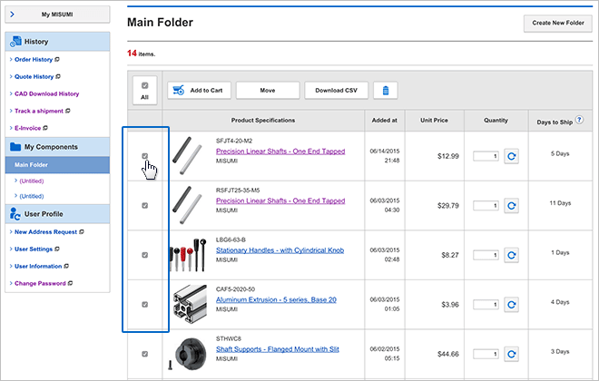 2 From the product list, select the products to be listed in the downloaded CSV file