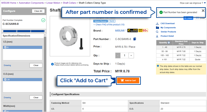 - *The ''Add to Cart'' icon will be displayed after the part number is confirmed.