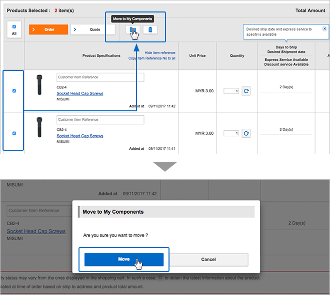 - Click ''Move'' to move the product from the cart to the main folder of ''My Components''.