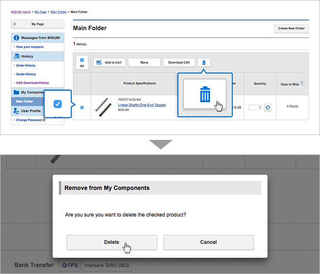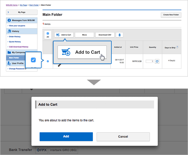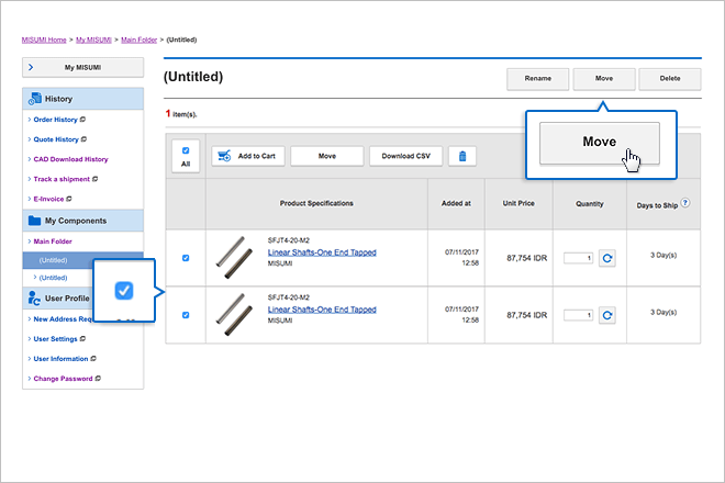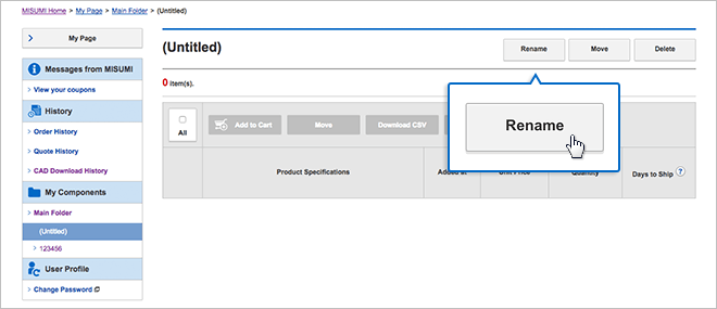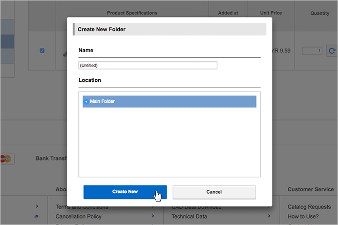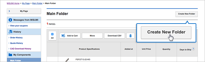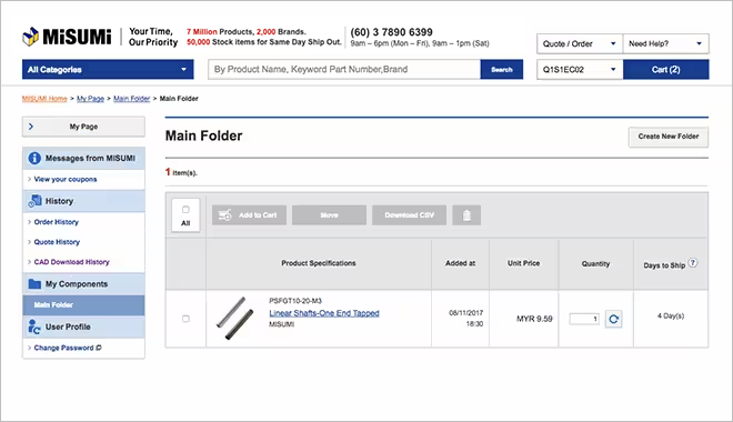 "My Components" allows you to save product information, such as part numbers, folders and manage the saved information folder by folder.
