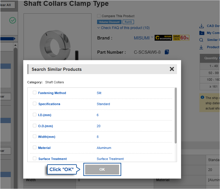 Select the category/specifications of the product you need from the list and click 'OK'.
