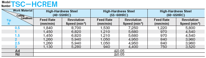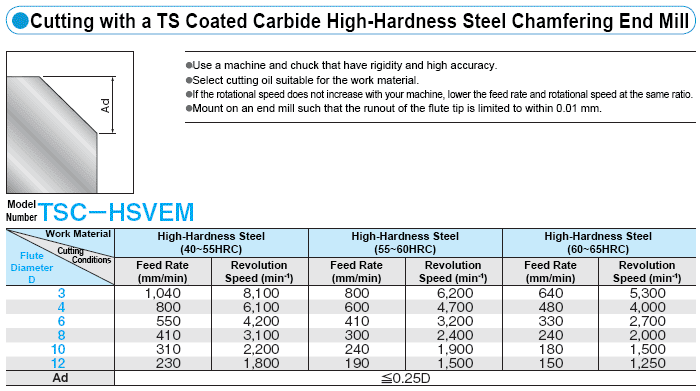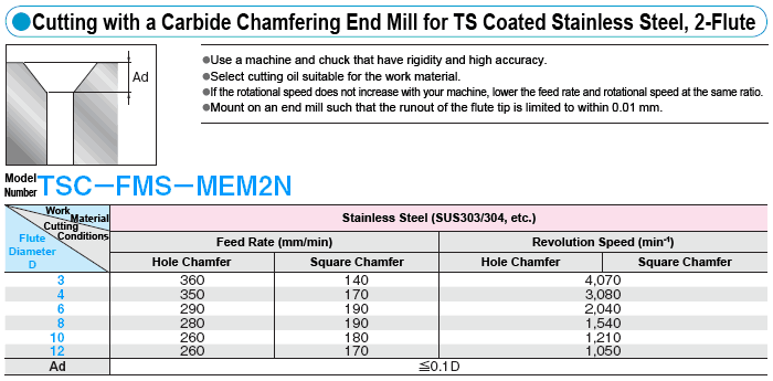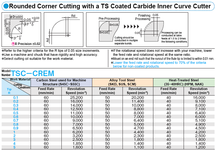 Carbide End Mill, Recommended Cutting Conditions Chamfering, Inner Curve