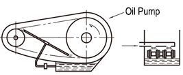 | Slinger Disk Lubrication | Oil is applied to the chain using a disk. The depth of the disk immersed in the oil should be approximately 20 mm, and the circumferential speed should be at least 200 m/min. | ||